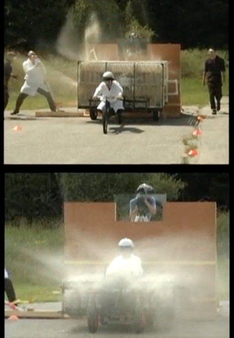 The Coke Zero & Mentos Rocket Cars were welded together by Nick Salvati with Big Dave Tardy and Mike Miclon. Nick and Dave built the Mark II on a pedal car frame. Nick and Mike built the Mark I on a utility trailer frame, along with the front end of a bicycle.